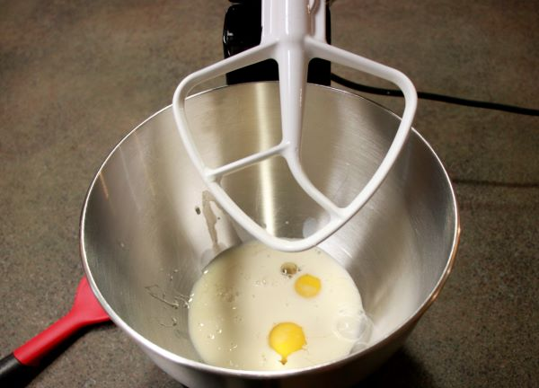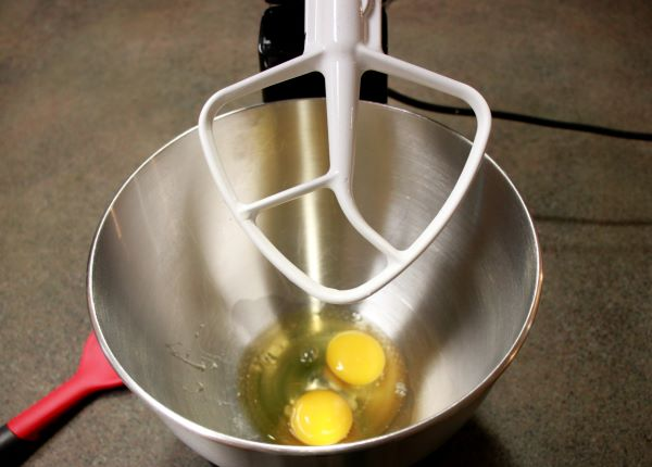 Now we start on the wet ingredients, lets start by adding them to a stand mixer so there is less cleaning up when we are done. Now add 2 eggs to the stand mixer.