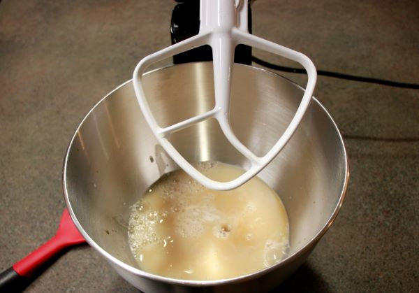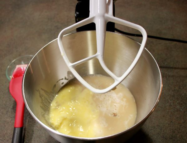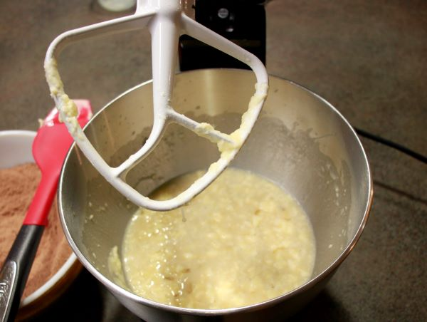 Pour the flour mixture into the mixer and turn in on low to try and keep the dry ingredients in the mixer. Have a spatula nearby to clean off the sides of the mixer so almost all of the dry and wet get mixed.